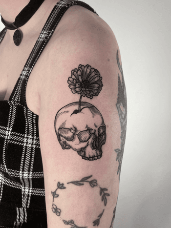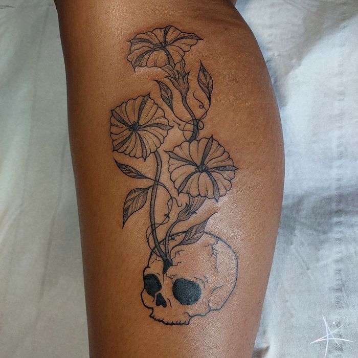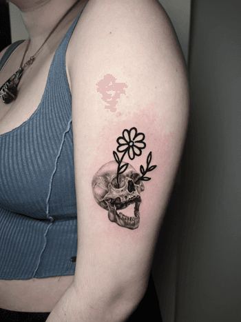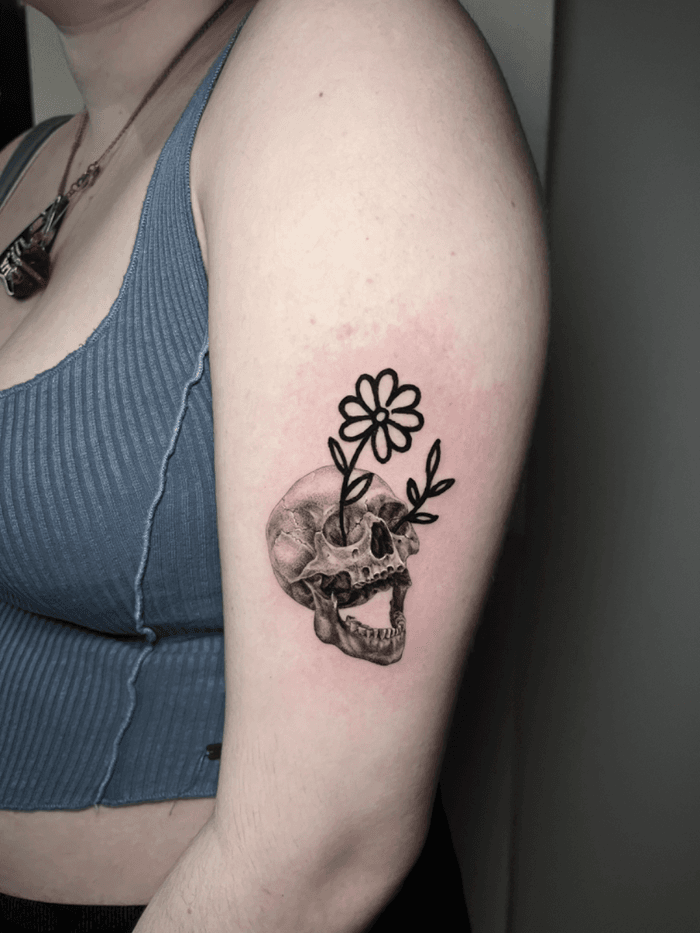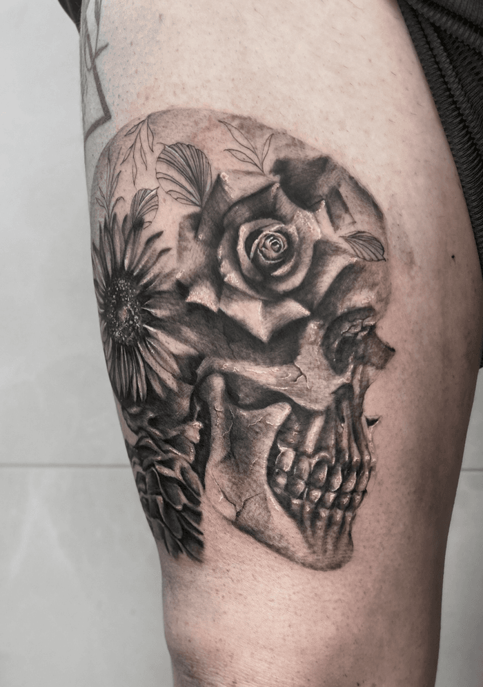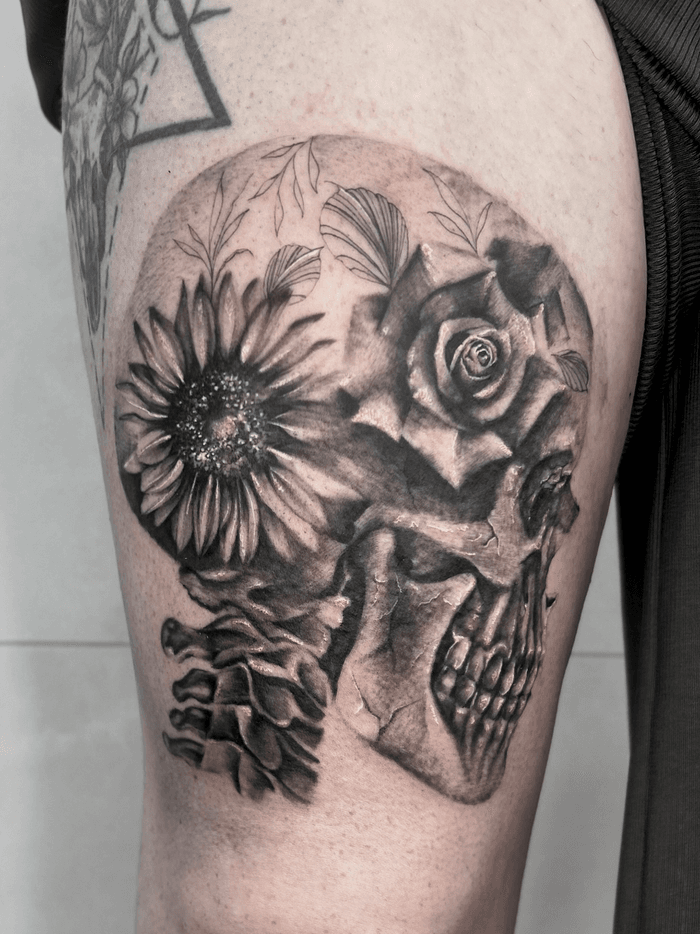 Dark botanical designs combining skulls with roses, peonies, cherry blossoms, and other flowers. Explore traditional skull and flower tattoos, realistic designs, and sugar skull variations.