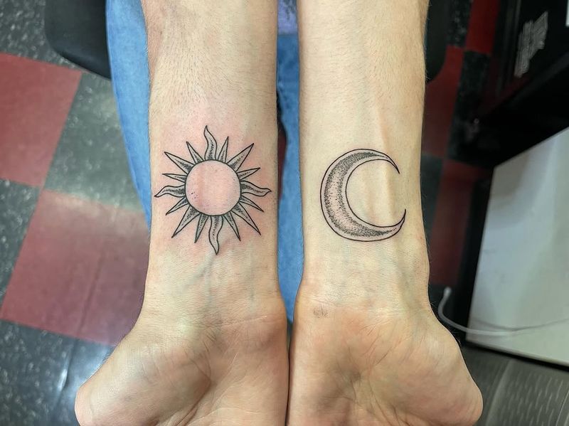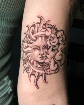 Celestial tattoo art featuring sun and moon combinations, crescent moons, blazing suns, and cosmic compositions. Explore traditional, minimal, and ornamental celestial tattoo designs.