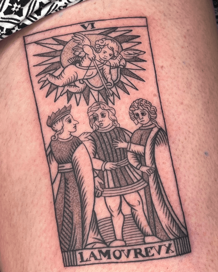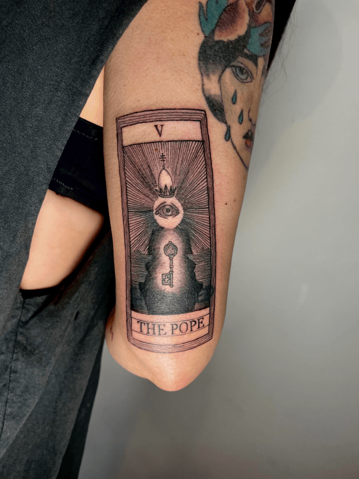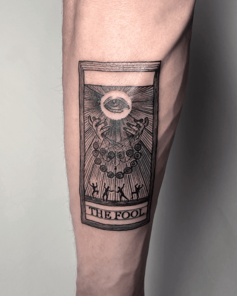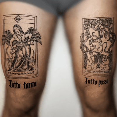 Tarot card tattoo art featuring major arcana designs, death card, sun card, moon card, and mystical symbolism. Explore traditional, illustrative, and minimalist tarot tattoo styles.