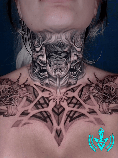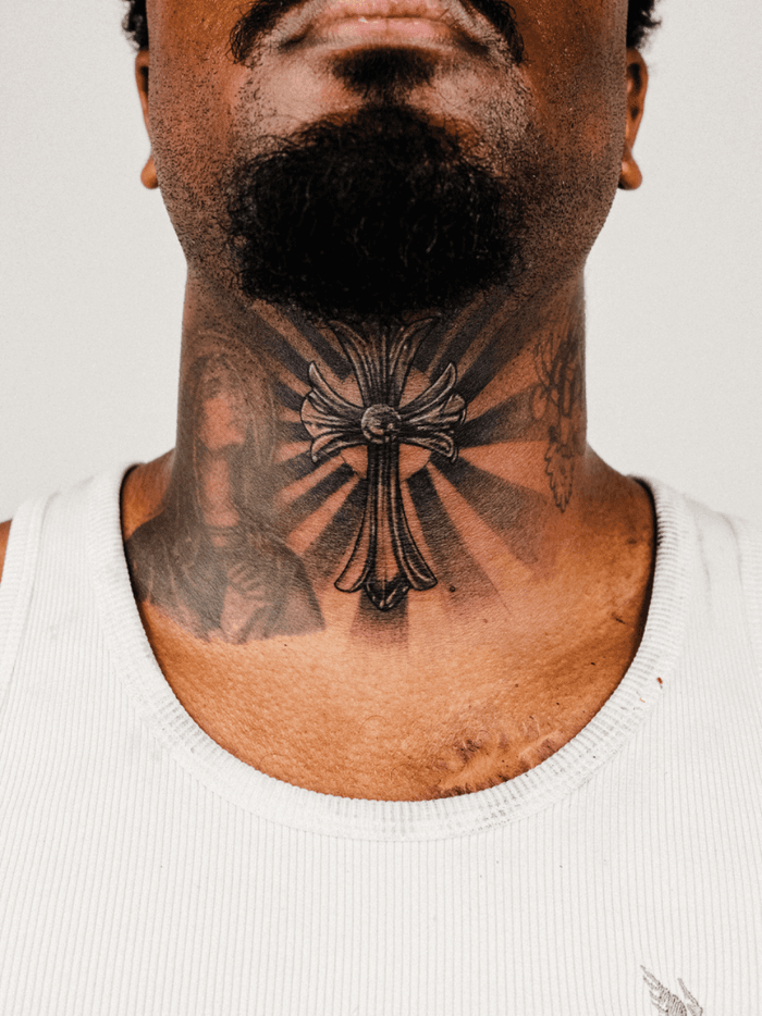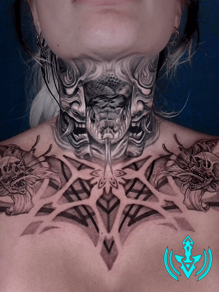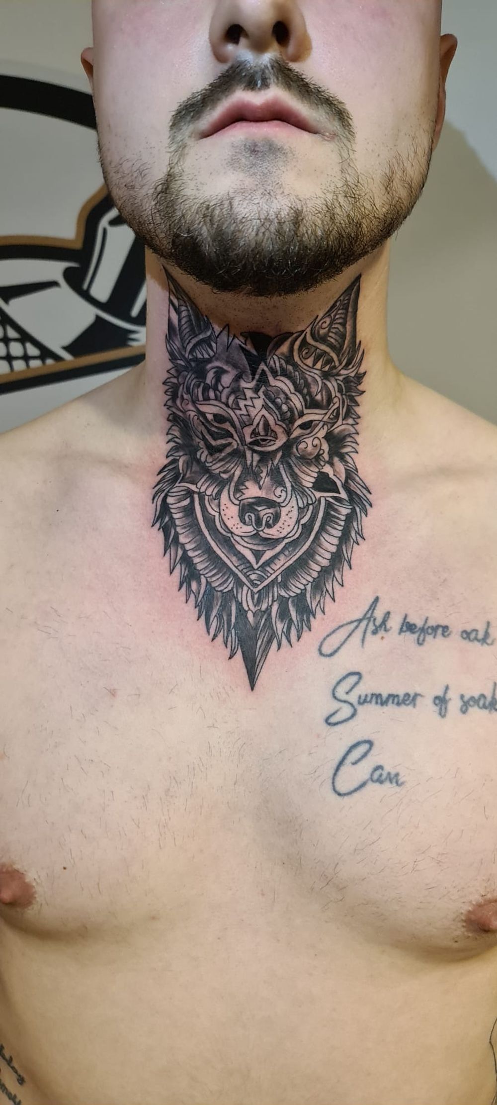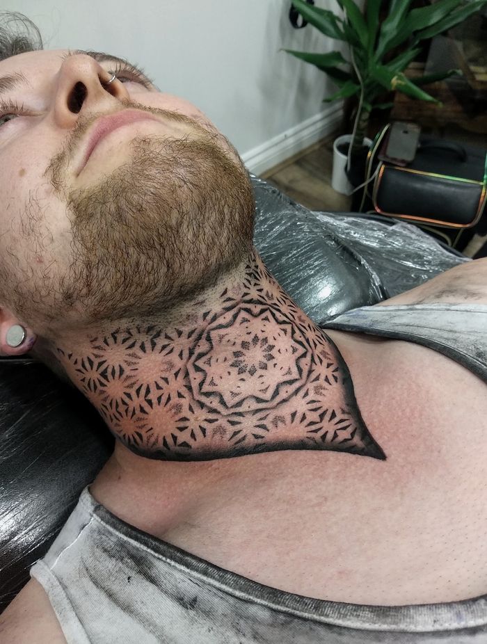 Bold throat and front neck tattoo designs including lettering, traditional motifs, wings, and ornamental patterns. Explore this high-visibility placement.