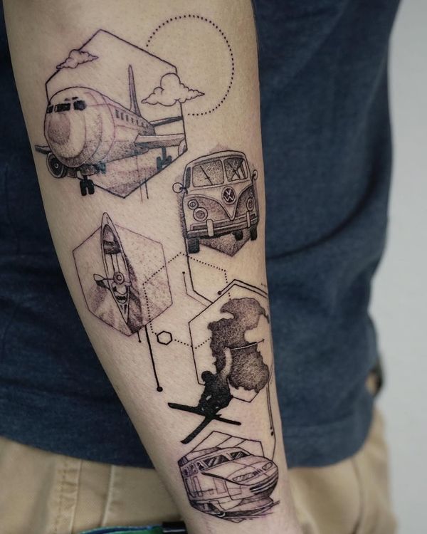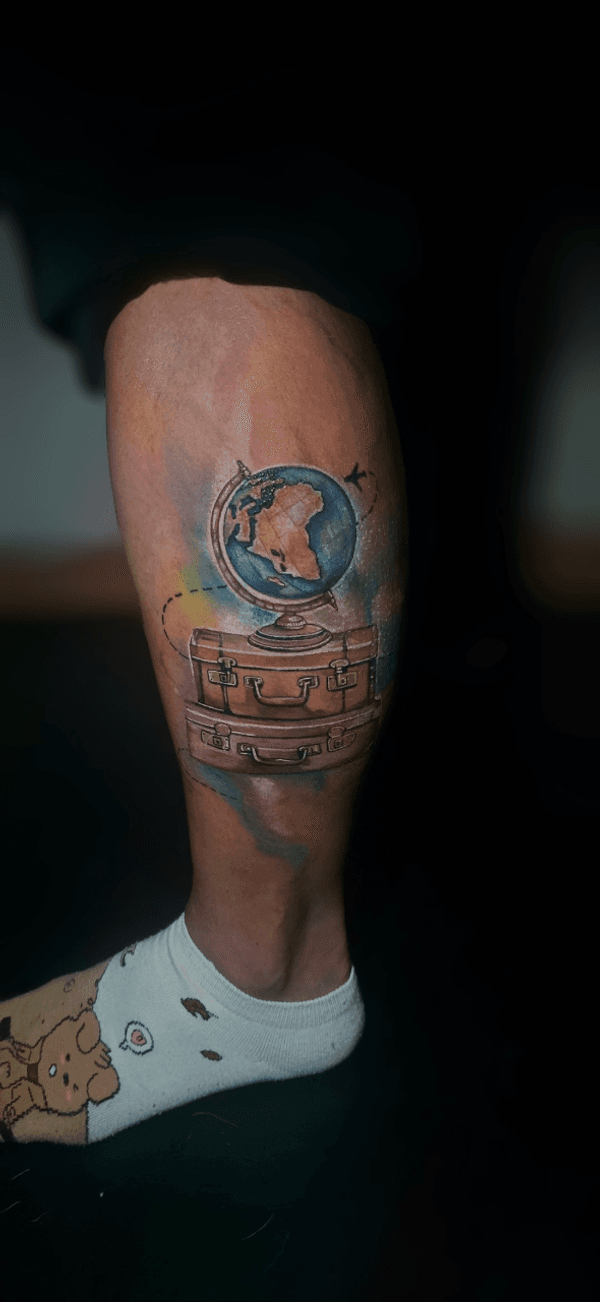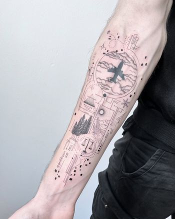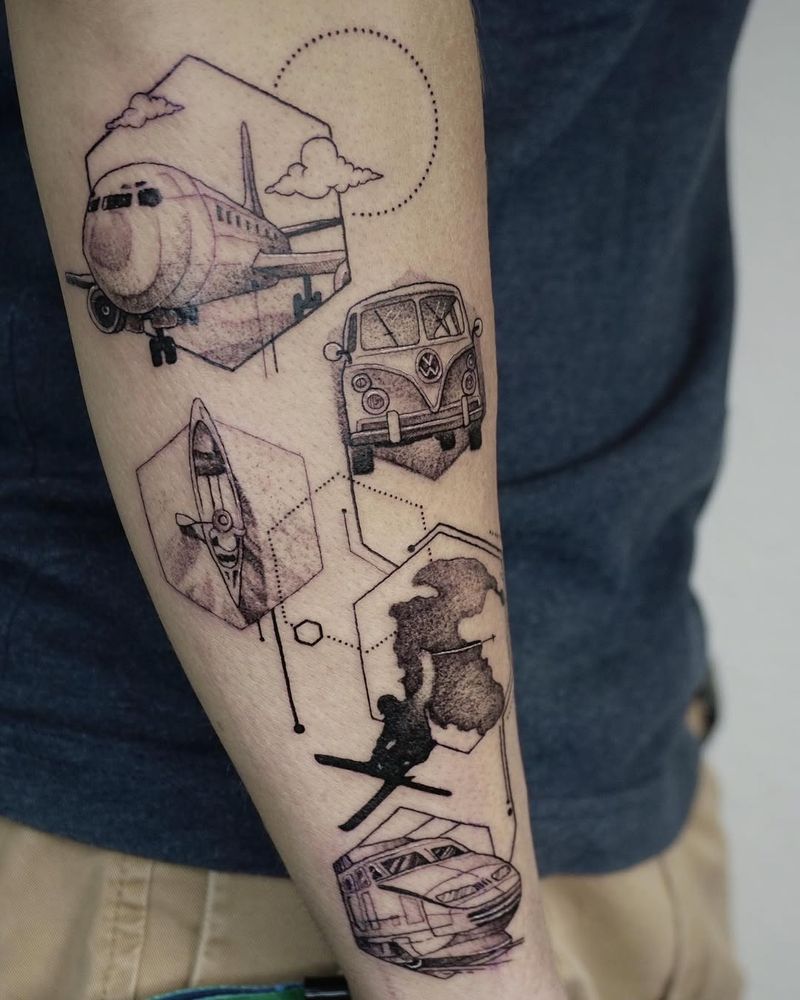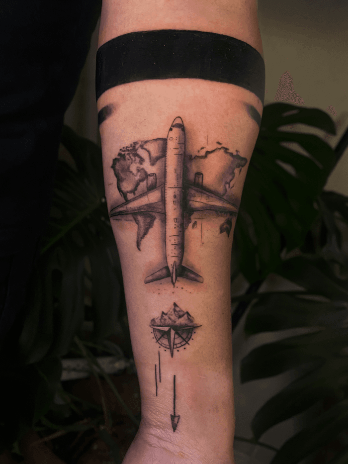 Travel-themed tattoo art featuring world maps, airplanes, passport stamps, and adventure symbols. Explore wanderlust, landmark, and explorer tattoo designs.